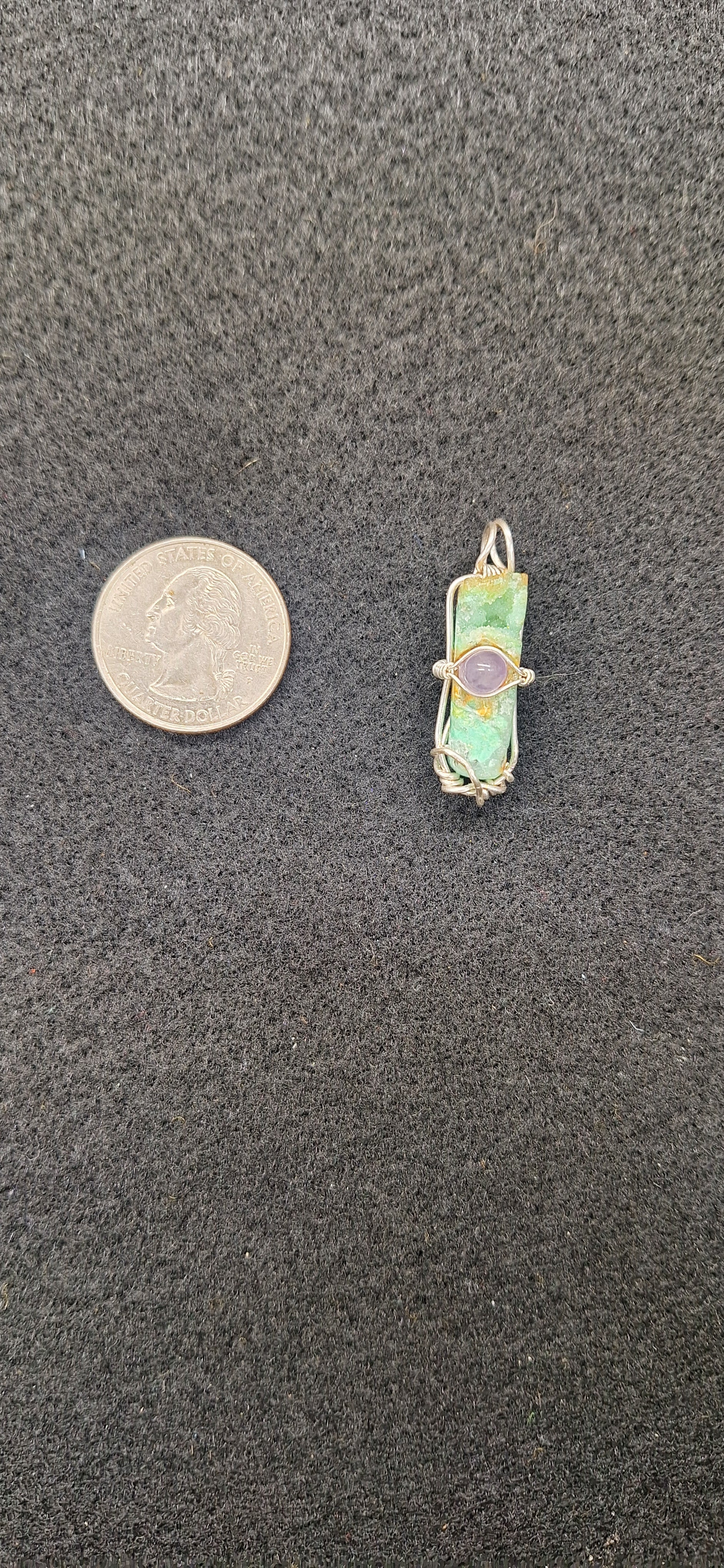 Smithsonite Cab polished on 4 sides other sides raw. Inlaid with a amethyst Cab. Wrapped with sterling silver.