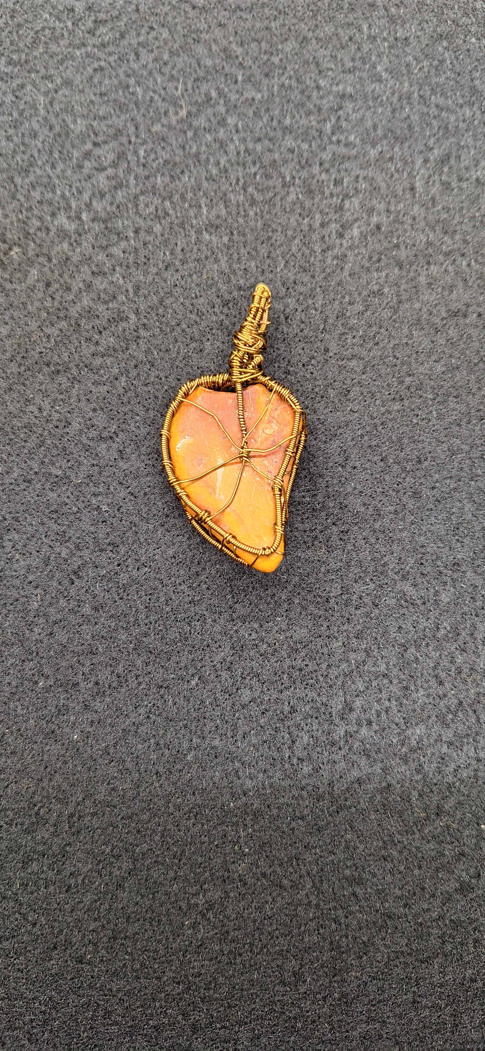 Mookaite jasper pendant. Wrapped with coated copper zebra wire. Please be advised this piece is darker in coloring than it appears in the picture.