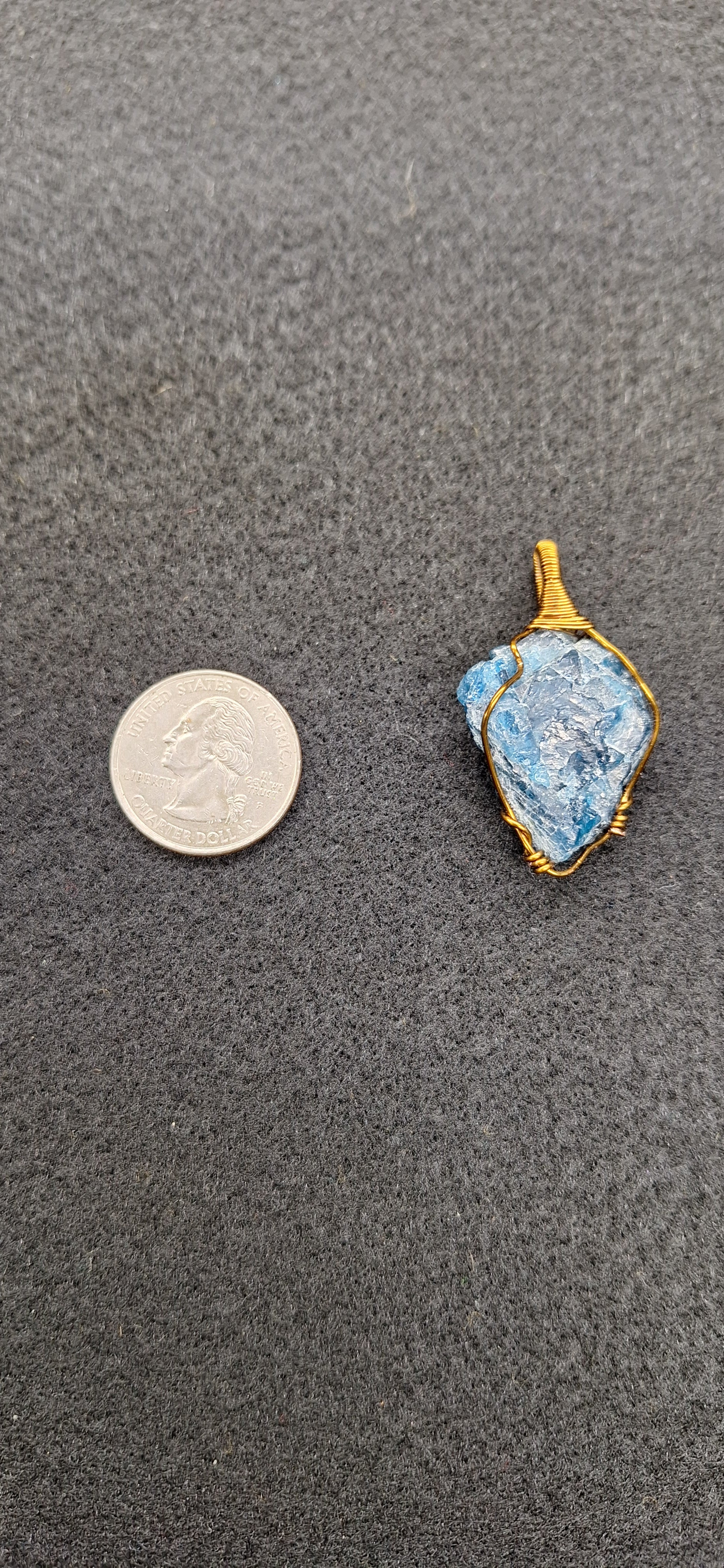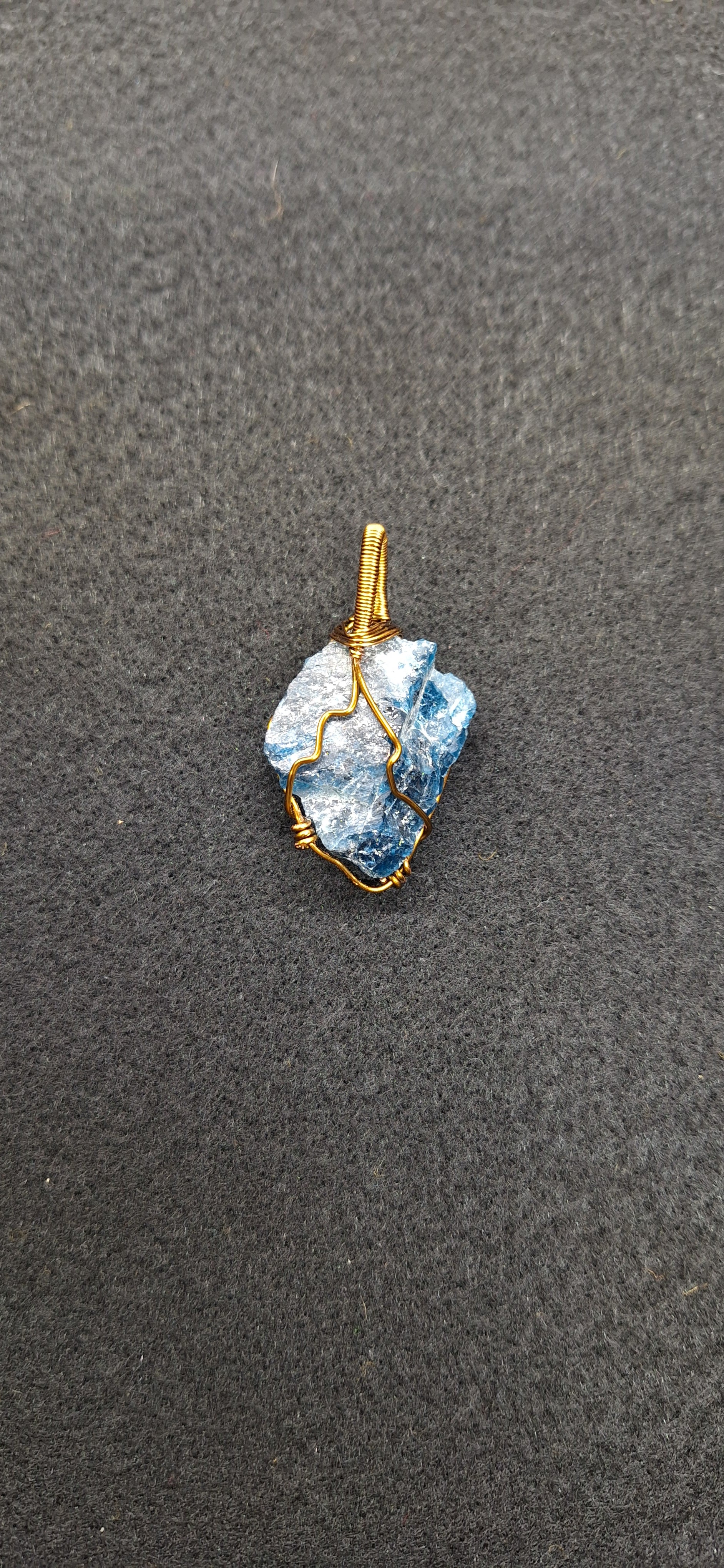 Raw blue apatite pendant. Wrapped in coated copper zebra wire.