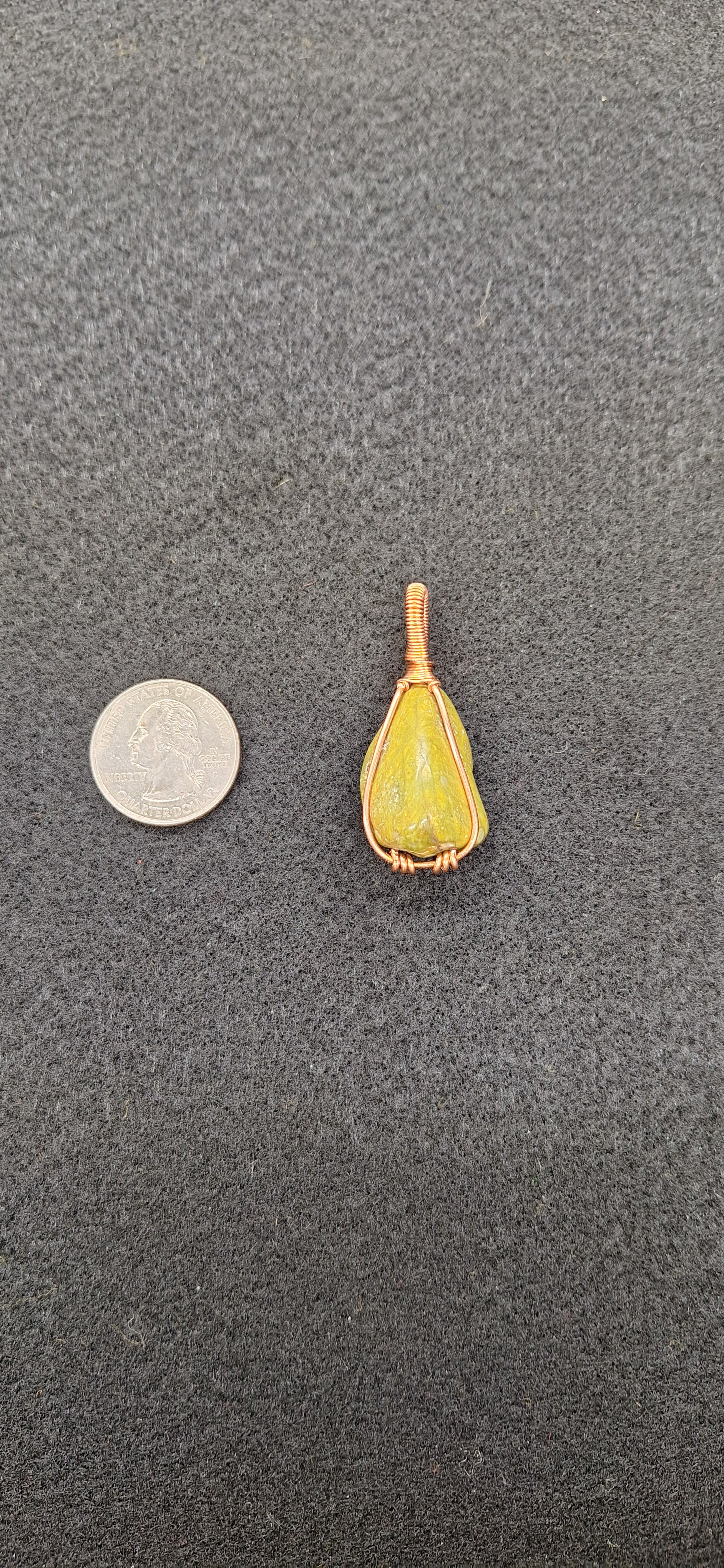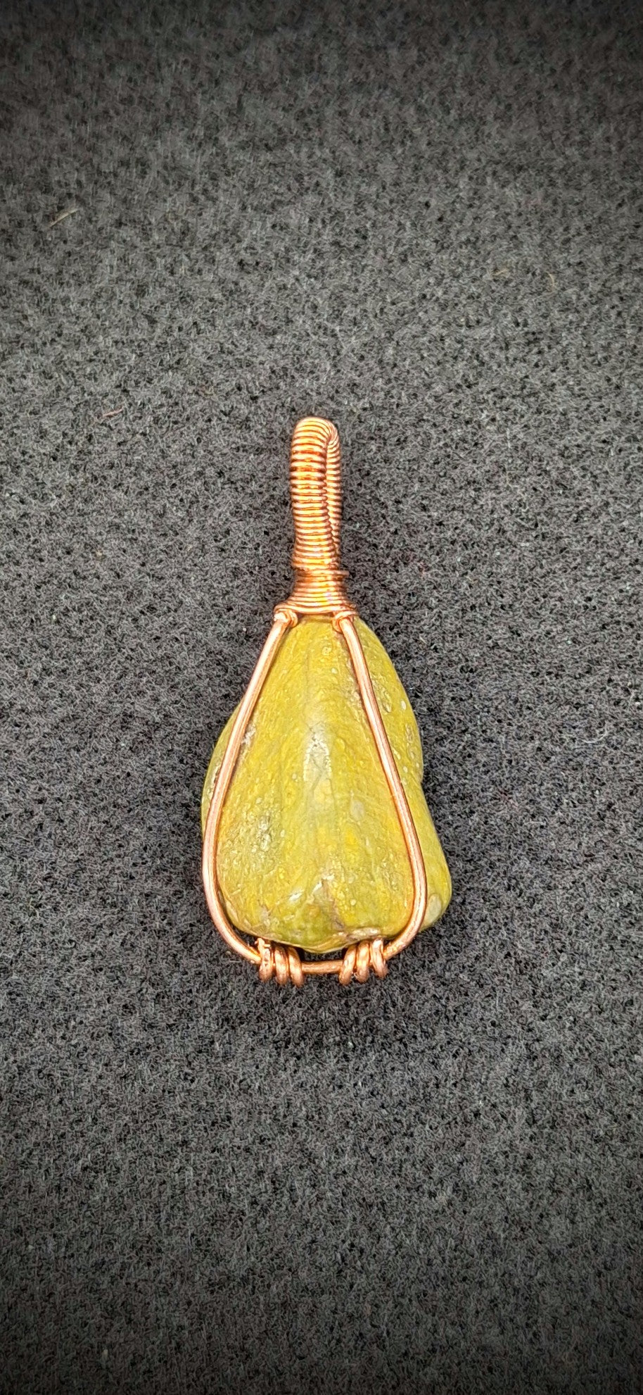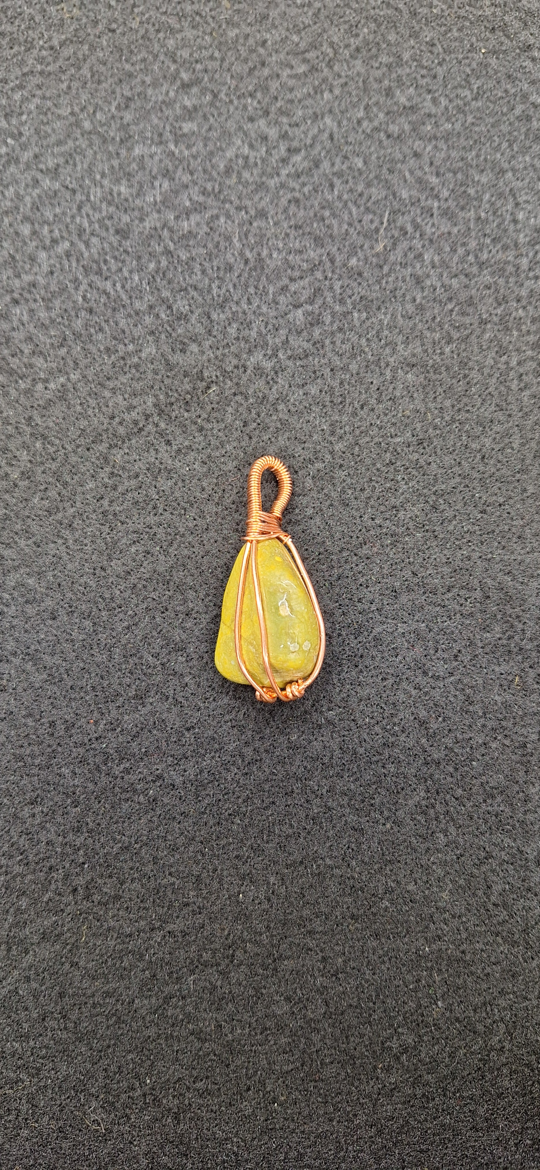 Tumbled serpentine pendant. Wrapped with coated copper zebra wire.