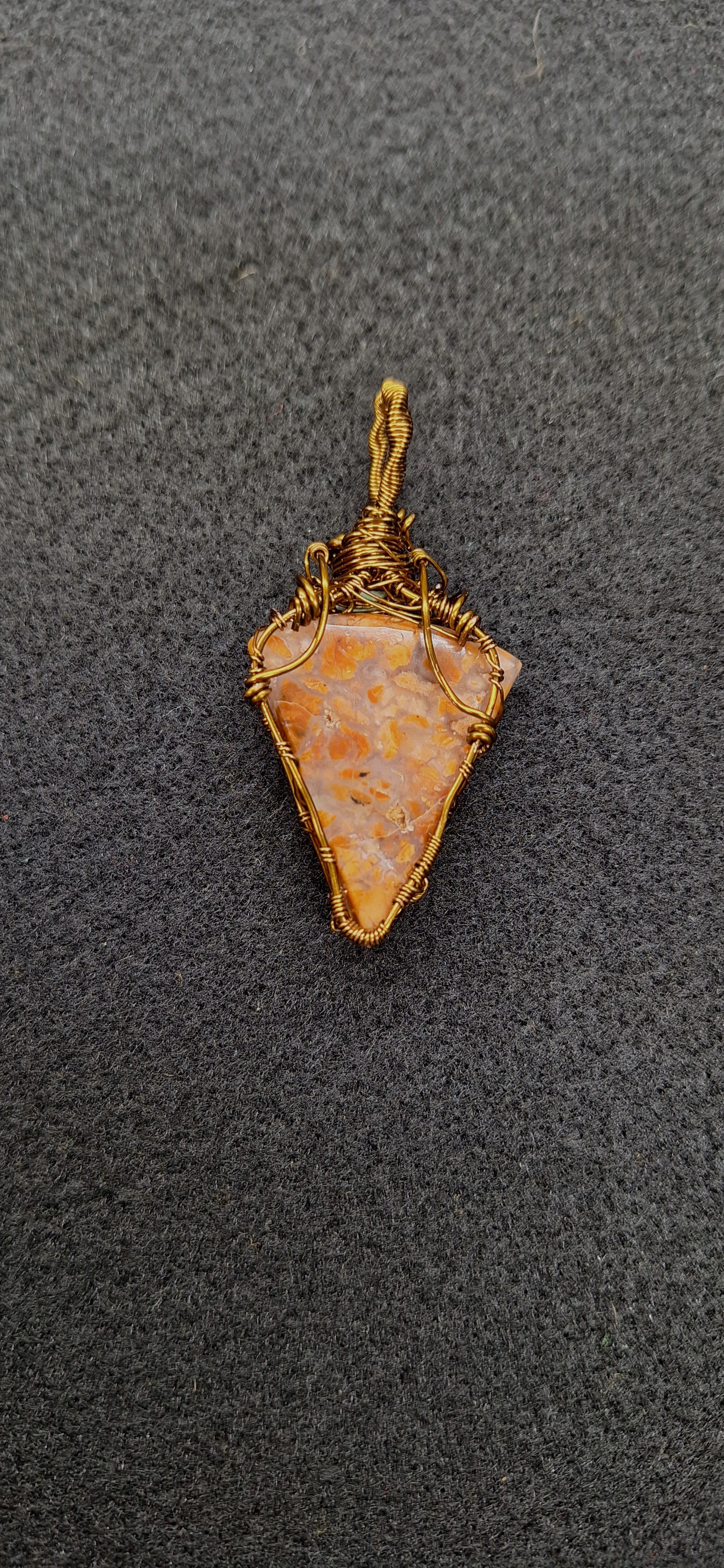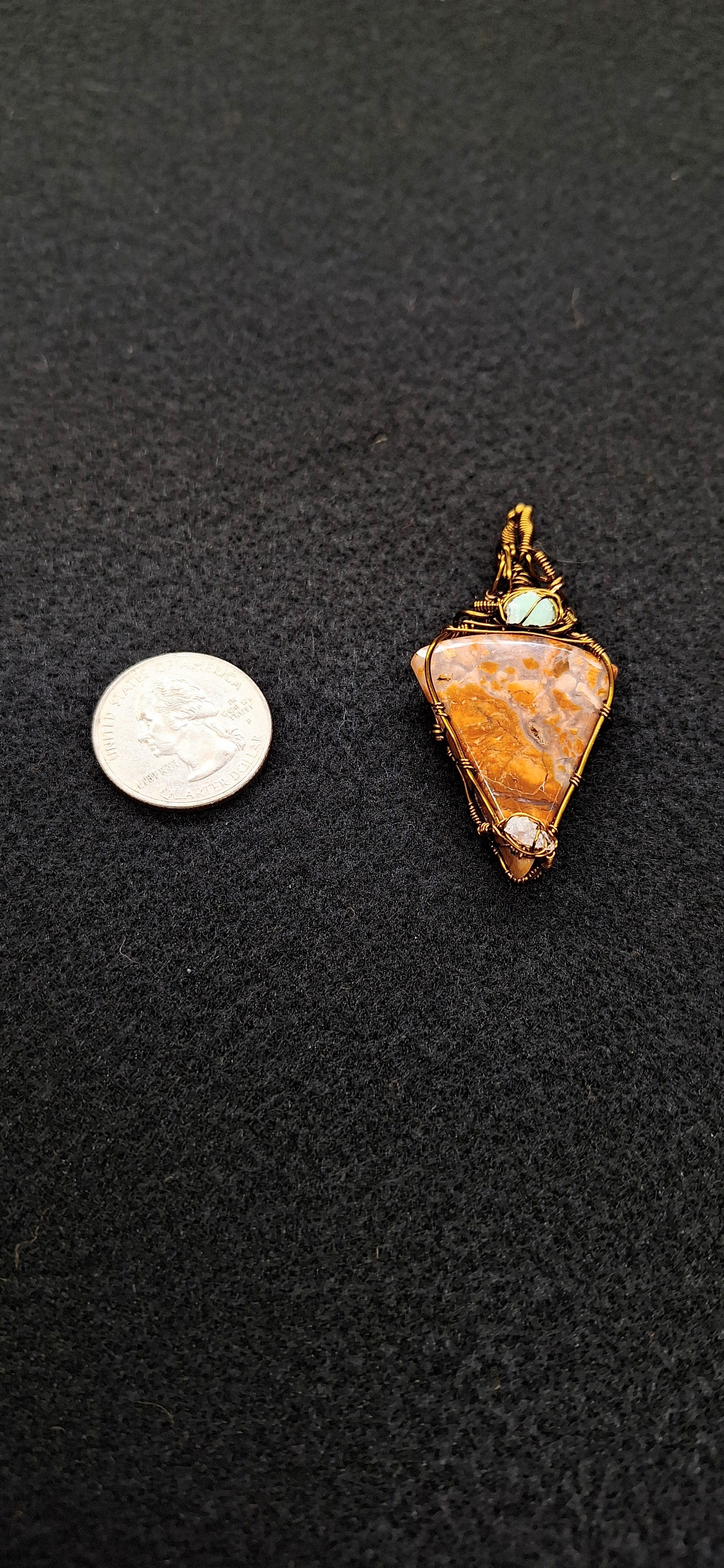 Youngite agate cabachon, smithsonite top gem, and clear quartz bottom gem. Wrapped with coated copper zebra wire. The piece of youngite came from a slab I got from a supplier from Colorado. I made the cabachon myself with love.