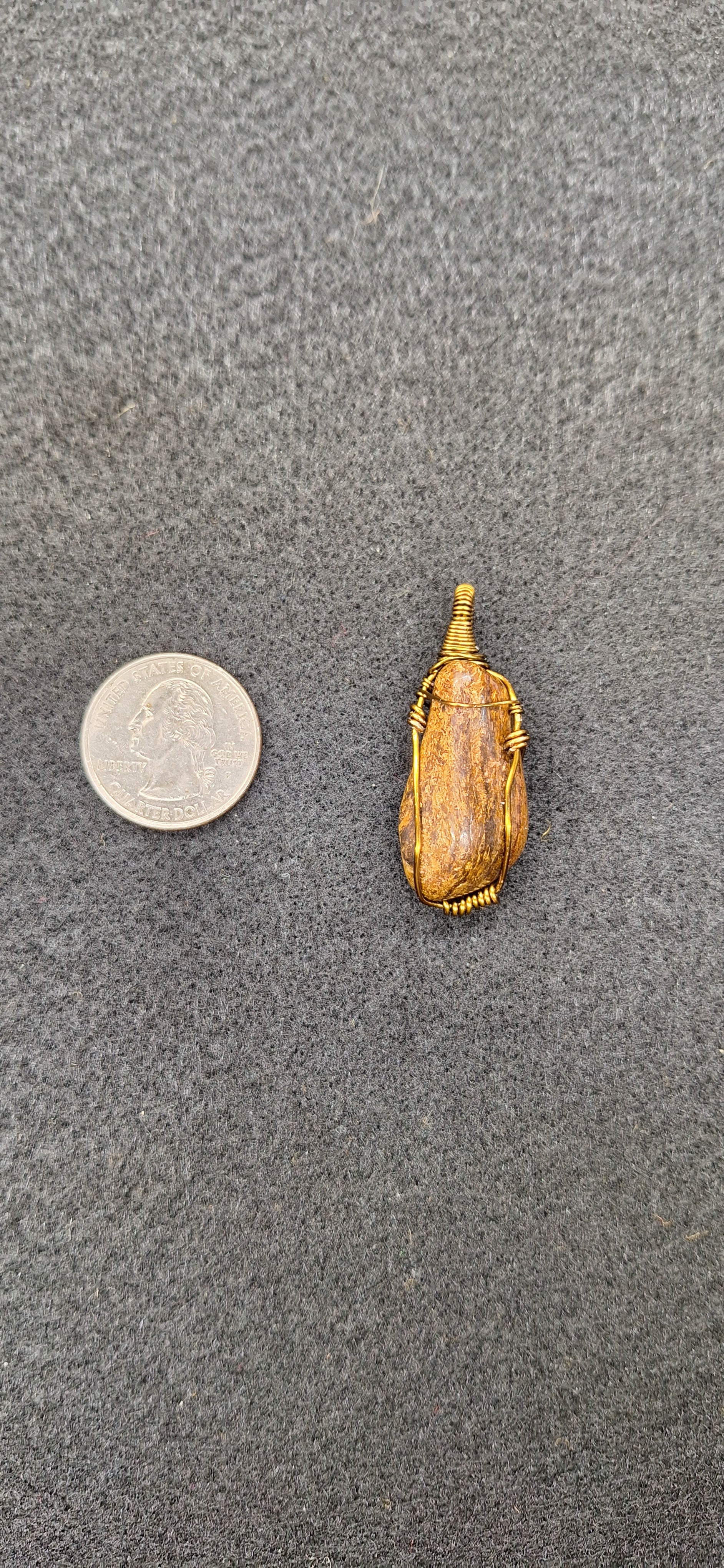 Tumbled bronzite pendant. Wrapped with copper coated zebra wire.
